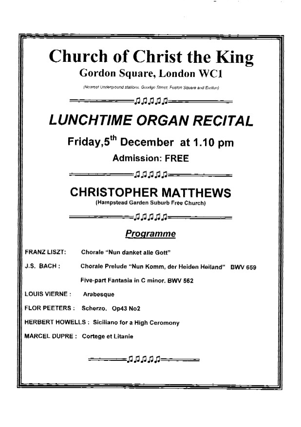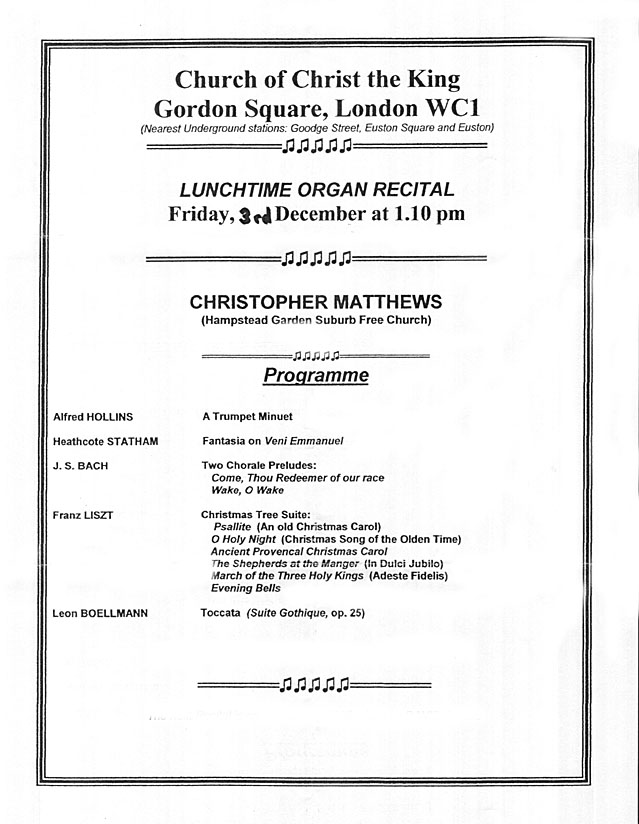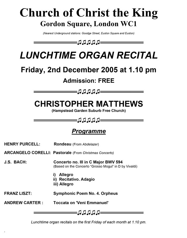 2 December 2005 Christ the King Church, Bloomsbury, London (Organ) Programme