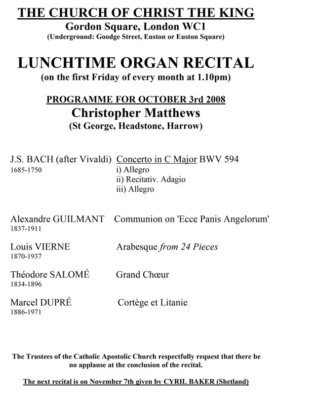 3 October 2008 Christ the King Church, Bloomsbury, London (Organ) Programme