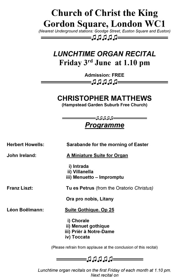 3 June 2005 Christ the King Church, Bloomsbury, London (Organ) Programme Review