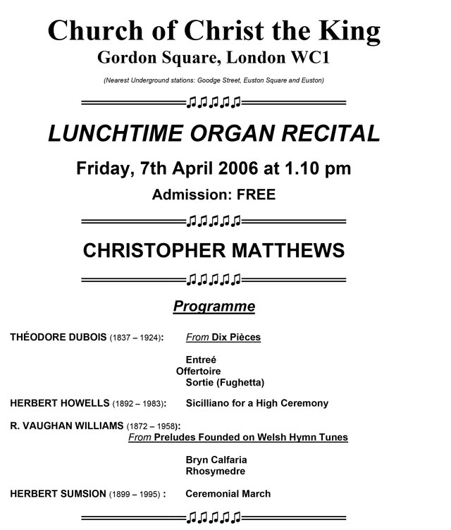 7 April 2006 Christ the King Church, Bloomsbury, London (Organ) Programme