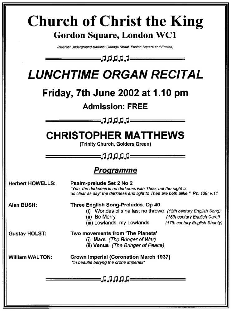 7 June 2002 Christ the King Church, Bloomsbury, London (Organ) Programme