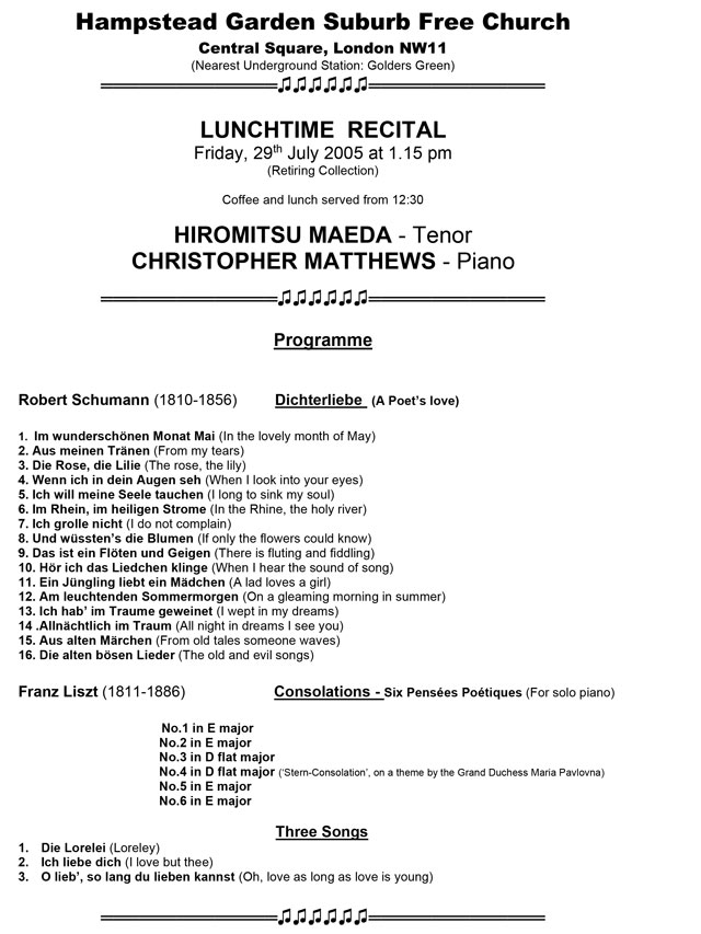 29 July 2005 Hampstead Garden Suburb Free Church (Piano & Tenor) Programme