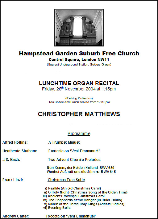 26 November 2004 Hampstead Garden Suburb Free Church (Organ) Programme