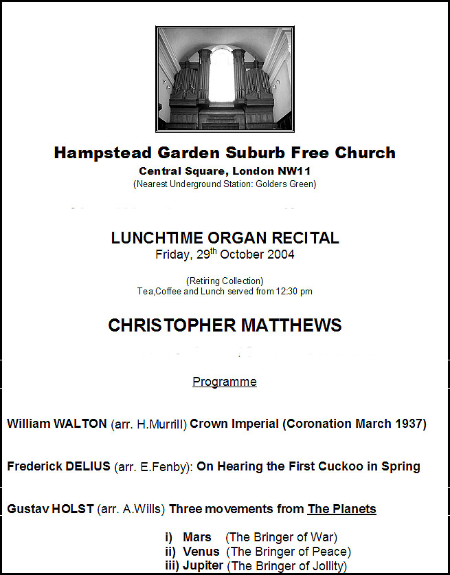 29 October 2004 Hampstead Garden Suburb Free Church (Organ) Programme