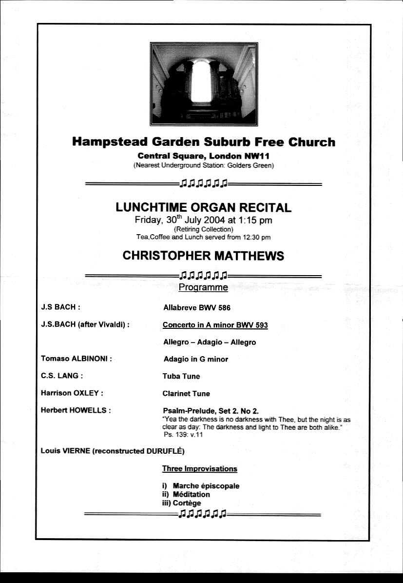 30 July 2004 Hampstead Garden Suburb Free Church (Organ) Programme