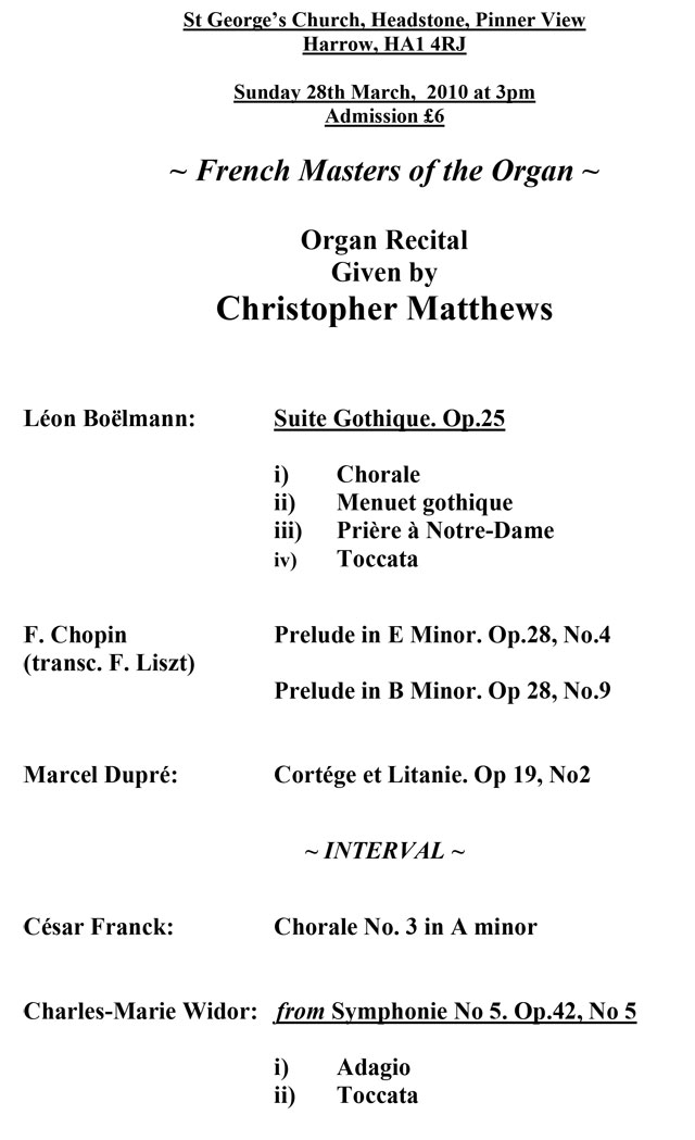 28 March 2010 St George's Church, Headstone, Harrow (Organ) Programme