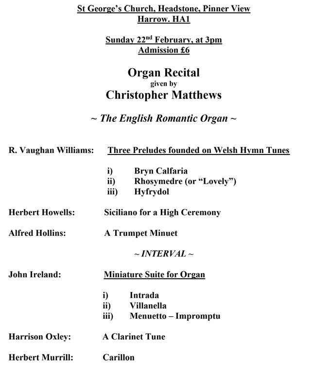 22 February 2009 St George's Church, Headstone, Harrow (Organ) Programme