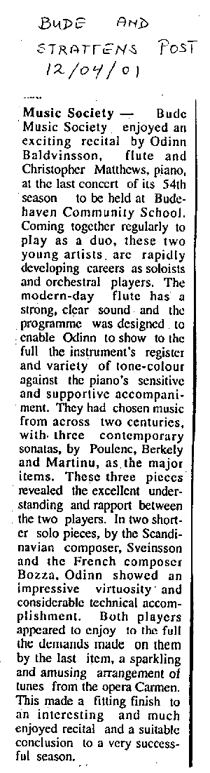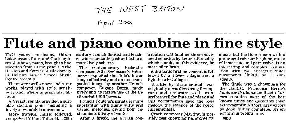 *6-7 April 2001 Bude and Helston, Cornwall (Piano & Flute) Martinu, Rachmaninov,Rutter, Taffanel, Sveinsson, Vivaldi, Bozza, Poulenc, Berkeley, Borne. Review 1 Review 2
